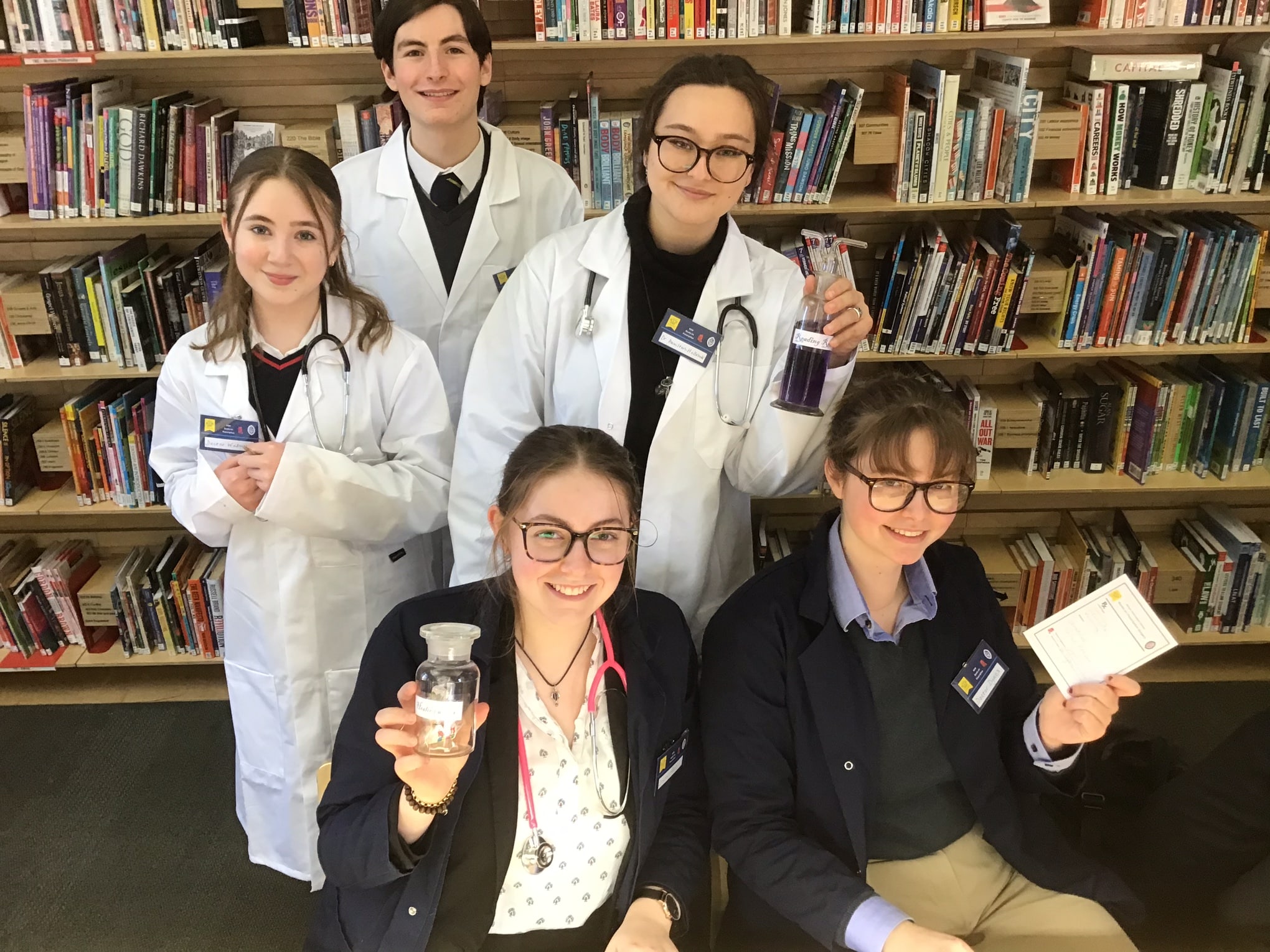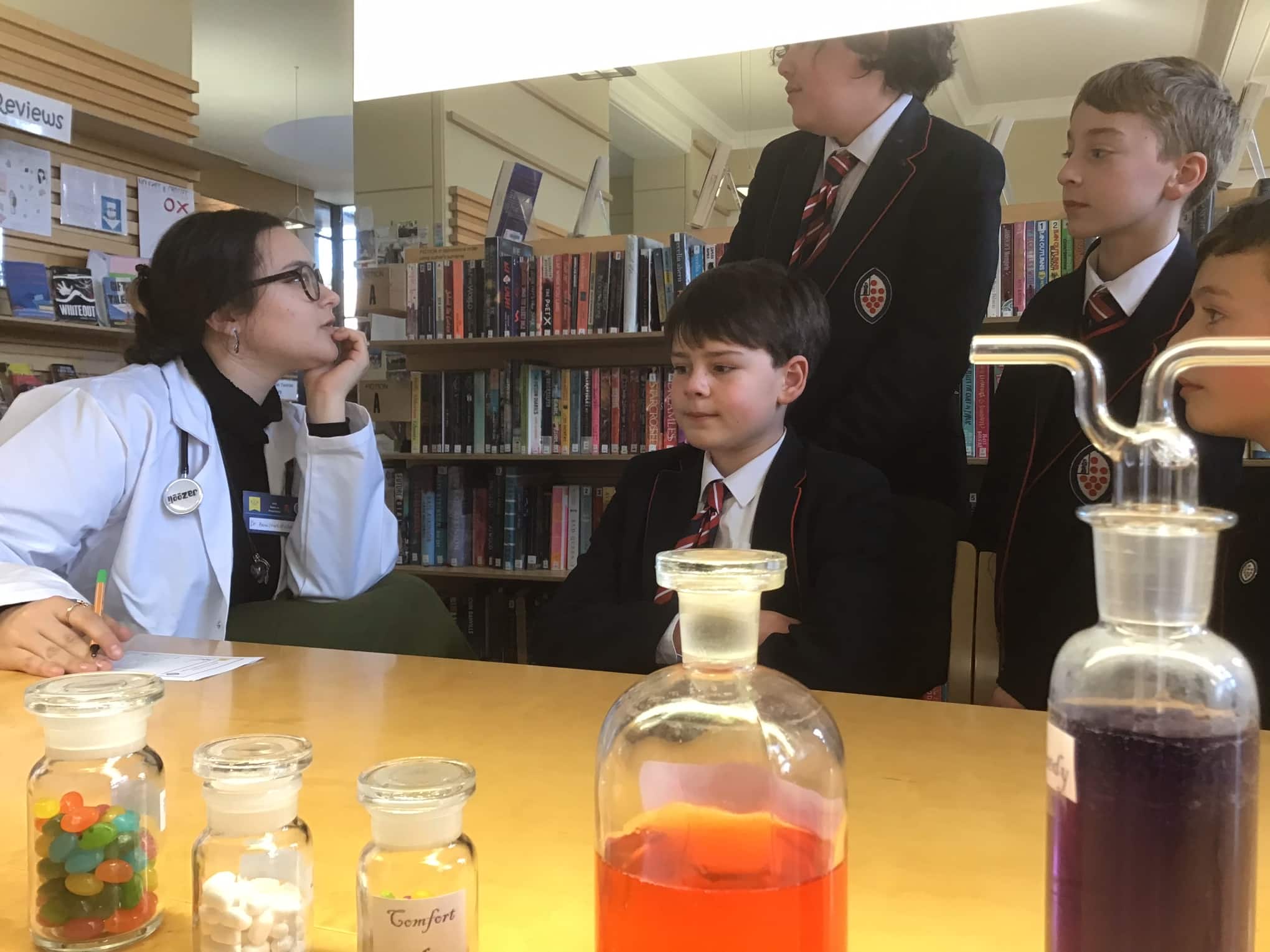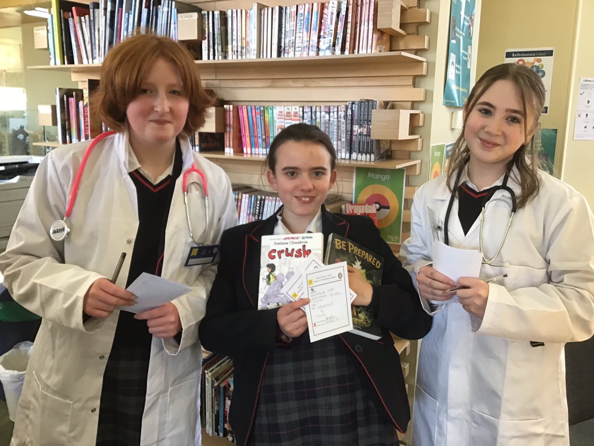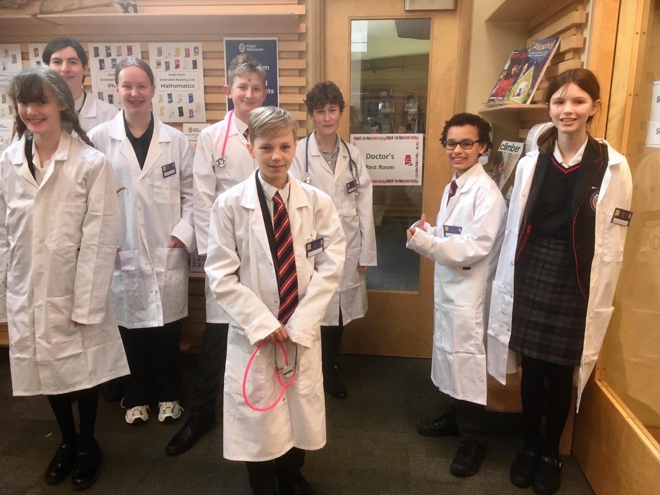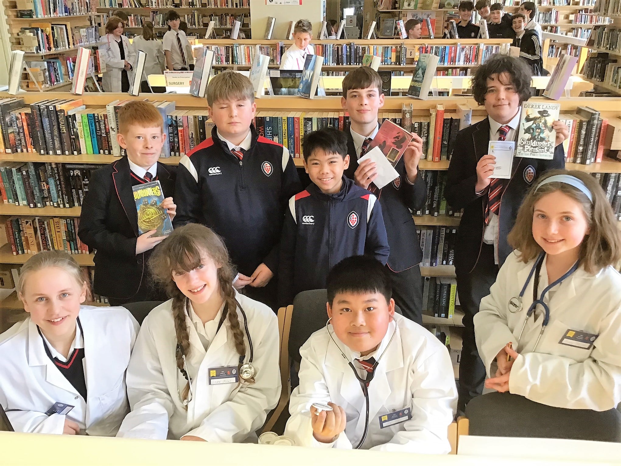 The highlight of the day was our Books on Prescription lunch time Surgery staffed by 25 pupil doctors (our keenest readers from years 7 – 13, and mostly book club members). The library was transformed into a surgery, with waiting room, staff room, x-rays, and consultation areas. The doctors were all kitted out with white coats (or blue coats for 6th form consultants), stethoscopes, prescription pads, badges, pill bottles and potions. We had plenty of patients coming for consultations with our various specialists in Fantasy, Science fiction, and Graphic novels (to name but a few!) and going away with books prescribed to meet their reading needs. It was fantastic to see the School Library so busy and buzzy with book talk, and everyone involved agreed that it was great fun. It was also magical to witness the variety of book recommendations made to our pupil patients by our very dedicated and enthusiastic doctors. The doctors found the experience very interesting and enjoyable.