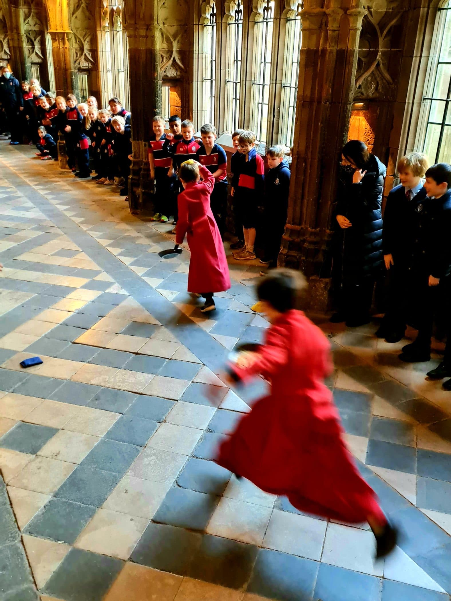An energetic way to start the day, the Pancake Race saw staff and pupils supporting the Choristers with enthusiastic, spirited cheering spurring on the teams. Having missed out on this historic event because of the pandemic last year, it was a delight to witness the children filling the stunningly beautiful venue with such a joyously raucous noise, something which is certainly not a daily occurrence in these usually tranquil surroundings.