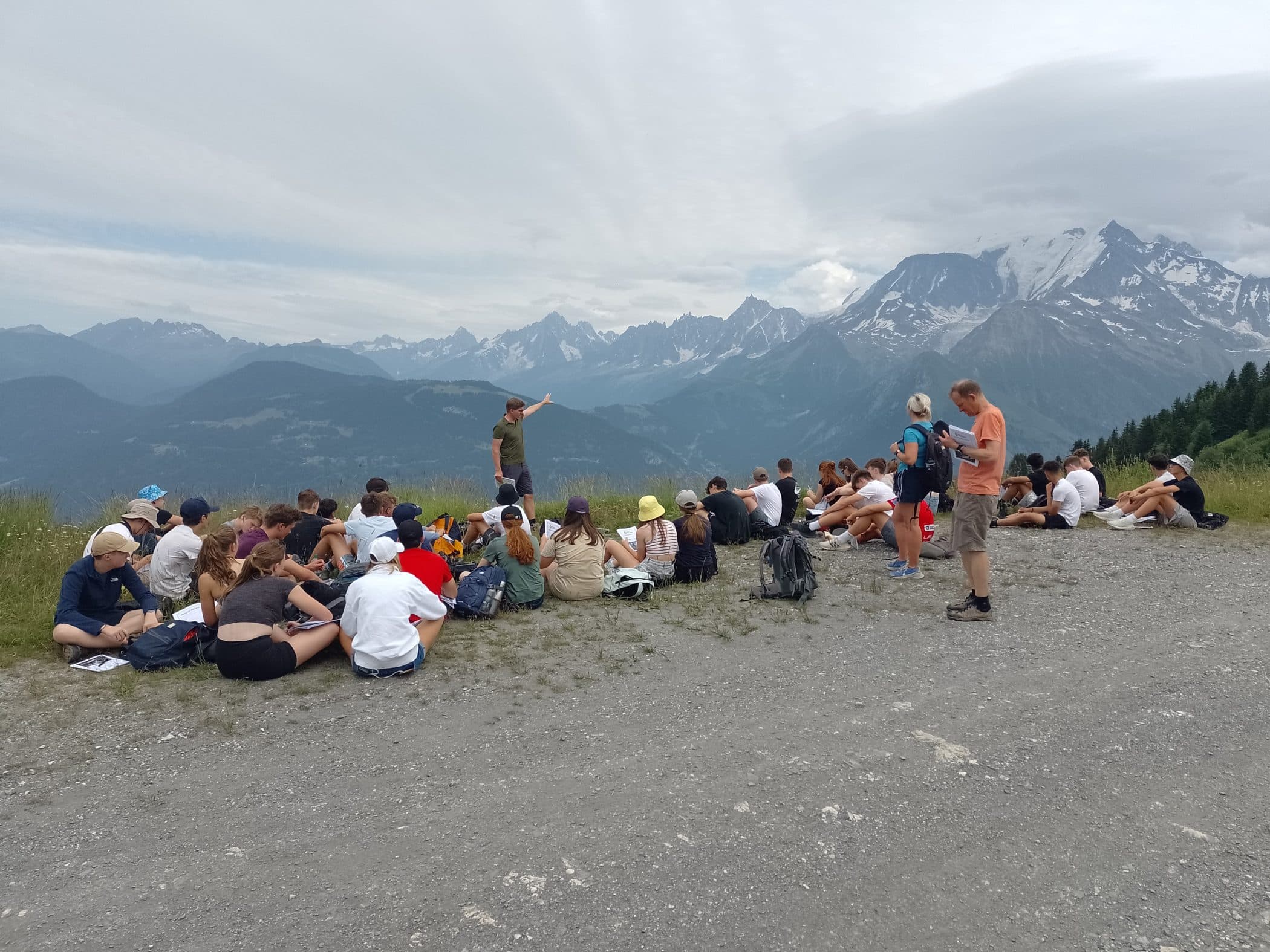 A return visit to Chamonix the next morning gave us the opportunity to find another stunning outdoor classroom at 2,400m, with a spectacular backdrop of Mont Blanc and the Mer de Glace. An exciting chairlift ride took us to the snow line, where we had lunch before descending back to Chamonix for an exploration of this vibrant town. We concluded the day’s fieldwork with another swim in Lake Passy before returning to base for a final game of “car–park-cricket”.