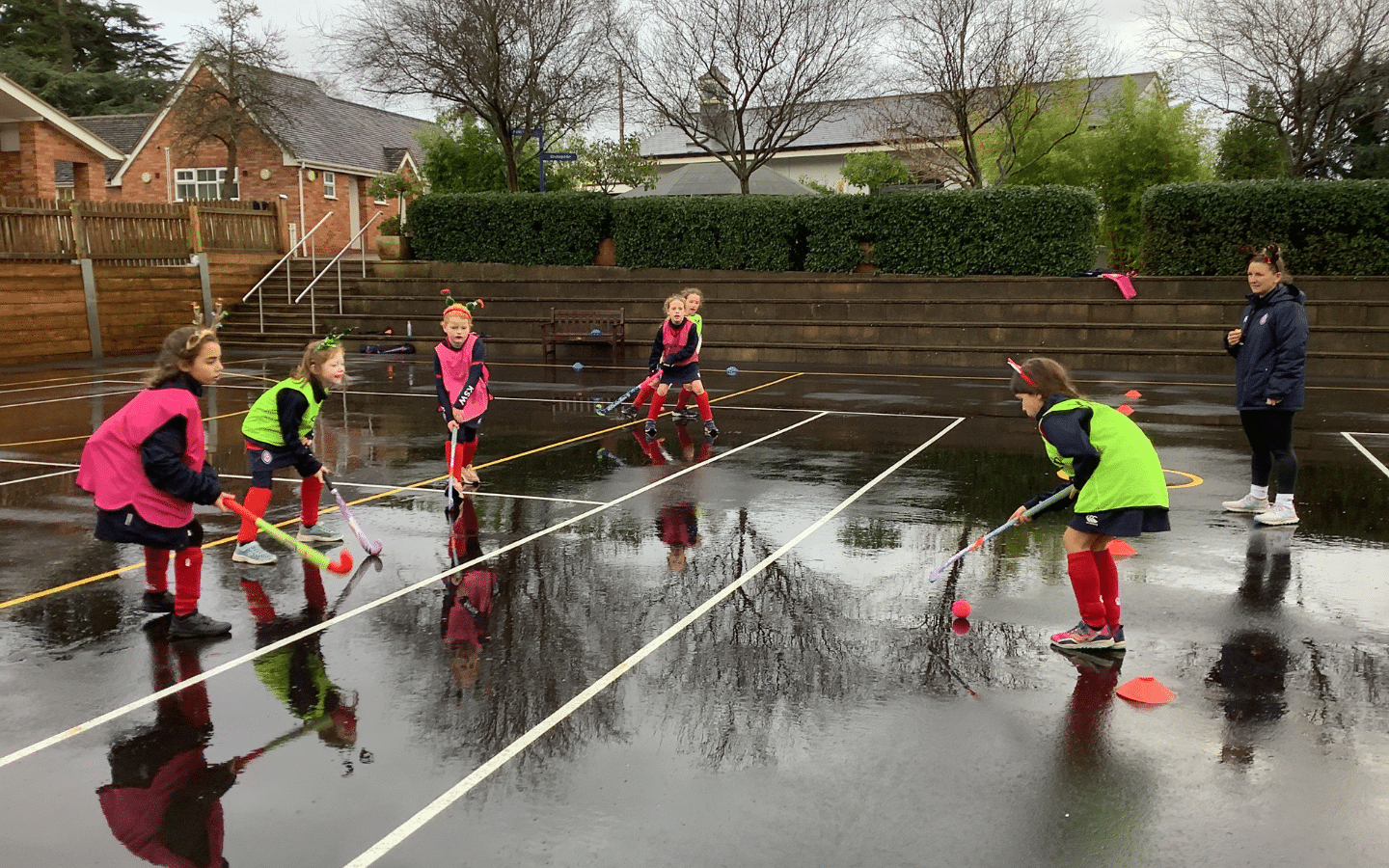 For their final Games lesson of the term, the Year Three and Four girls donned their festive headbands and hats and took part in a Christmas-themed round-robin tournament. The teams were the Jingle Bell Rockers, the Gingerbread Girls, the Snowball Slingers, the Holly Jolly Heroes, the Rudolph Runners and Santa’s Little Helpers, and they embraced the wet Hard-Surface and played brilliantly throughout. Mrs Butt and Miss Lake were extremely impressed by all of the girls’ attitudes and identified several Players of the Tournament for their skill and teamwork on show: Jasmine O, Florrie W, Ruby K, Robyn C, Amelie B, Persie D, Valerie M, Alanna A, Maisie L and Adelyn K. Sophia R also showed great sportsmanship by congratulating the winning team members after the results had been announced. Congratulations go to the Jingle Bell Rockers, made up of Jasmine O, Annie W, Simi H and Georgia P, who took first place, scoring 21 points!
