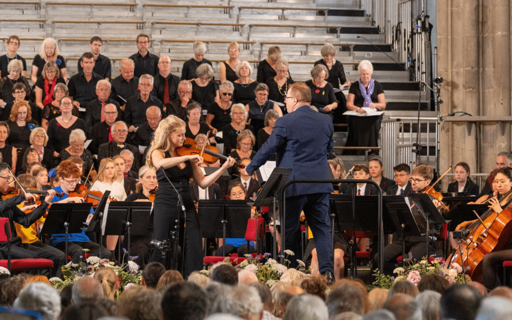 On the 6th day of the festival, it was the turn of more pupils from King’s to participate in two concerts. Earlier in the year King’s and the Three Choirs Festival worked together in partnership with primary schools from the city to put on a concert in the Cathedral featuring 200 children singing songs about nature. The daytime concert was a reprise of this event featuring performances from the Lower Years Choir and King’s St Alban’s Chamber Choir. Our pupils attend services in the Cathedral regularly but they were amazed at the different set-up during the festival with a professionally-designed stage, platform and tiered seating. A community choir of adults, who had come together just for this concert, had been rehearsed by Director of Music, Simon Taranczuk, throughout July. The concert also featured an orchestra of community players alongside members of The Philharmonia. Music Scholar, Rosie B, was selected as one of the soloists for a performance of Vivalidi’s The Four Seasons. Rosie is an experienced performer and her confidence shone through on stage performing to an audience of 500. It was a great celebration of music in the community and King’s was proud to play a major role in this concert. Rosie leaves King’s to focus on her Musical Theatre studies and we wish her every success and thank her for her commitment to music throughout her time here.