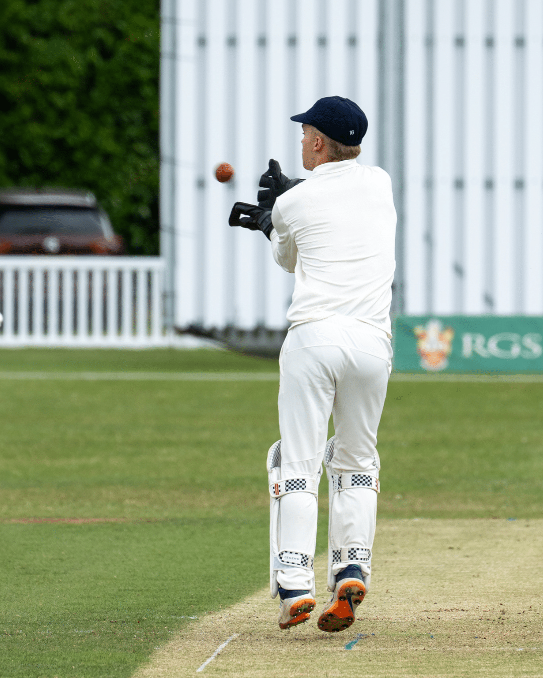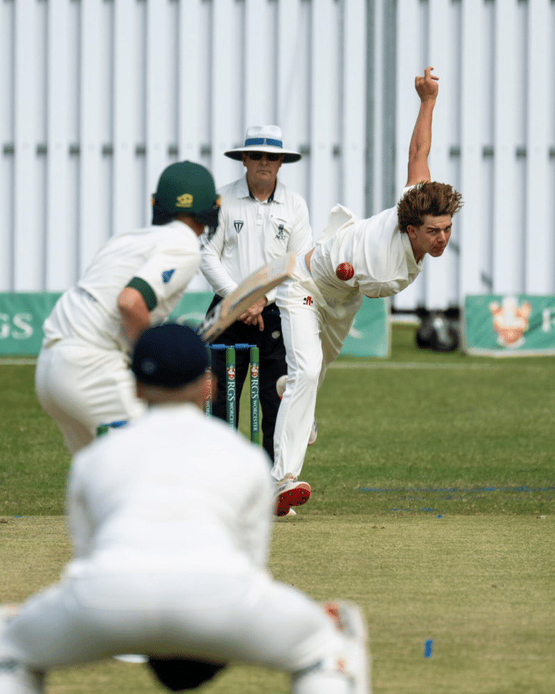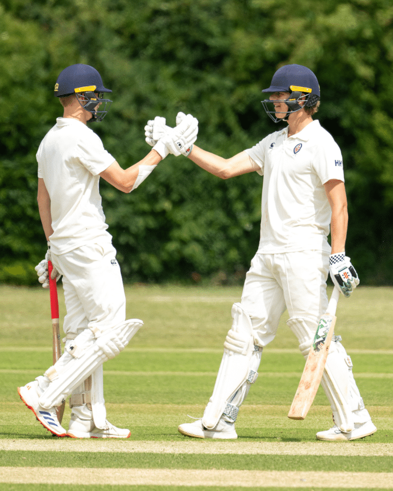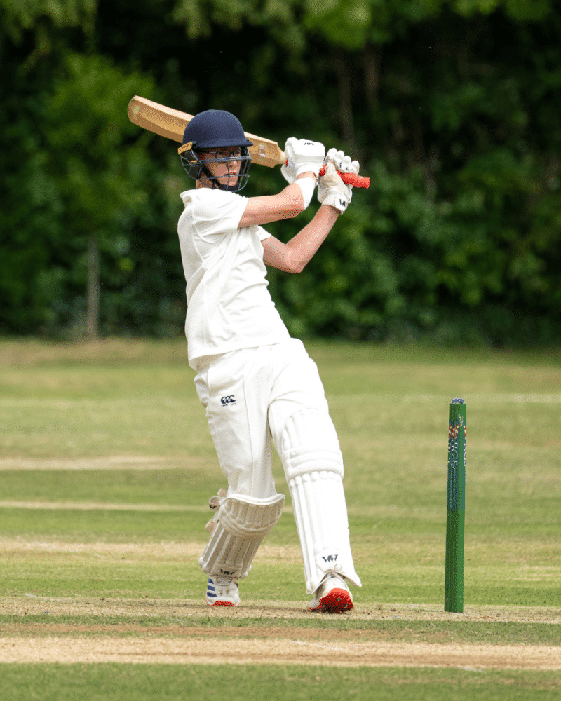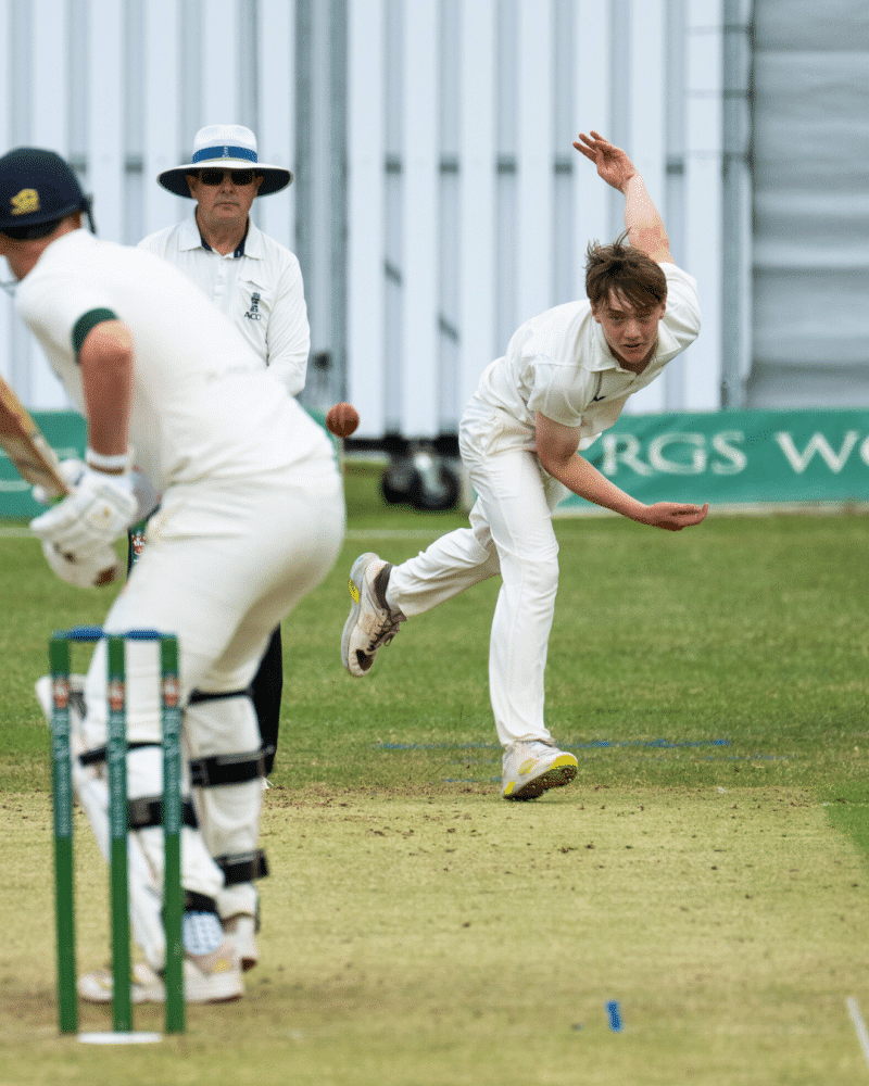 At 77-0, RGS looked well set, but that’s when Ollie Y stepped up. What followed was a remarkable spell of left-arm spin bowling. Displaying outstanding control and subtle variations, Ollie tore through the RGS batting line-up, taking 7 wickets for just 16 runs. He was ably supported by Ben E, who contributed a tidy 2-15 from his five overs. The ruthlessness of the 1st XI was clear to see and meant for a staggering collapse from 77-0 to 106 all out, with RGS losing all ten wickets for just 29 runs.