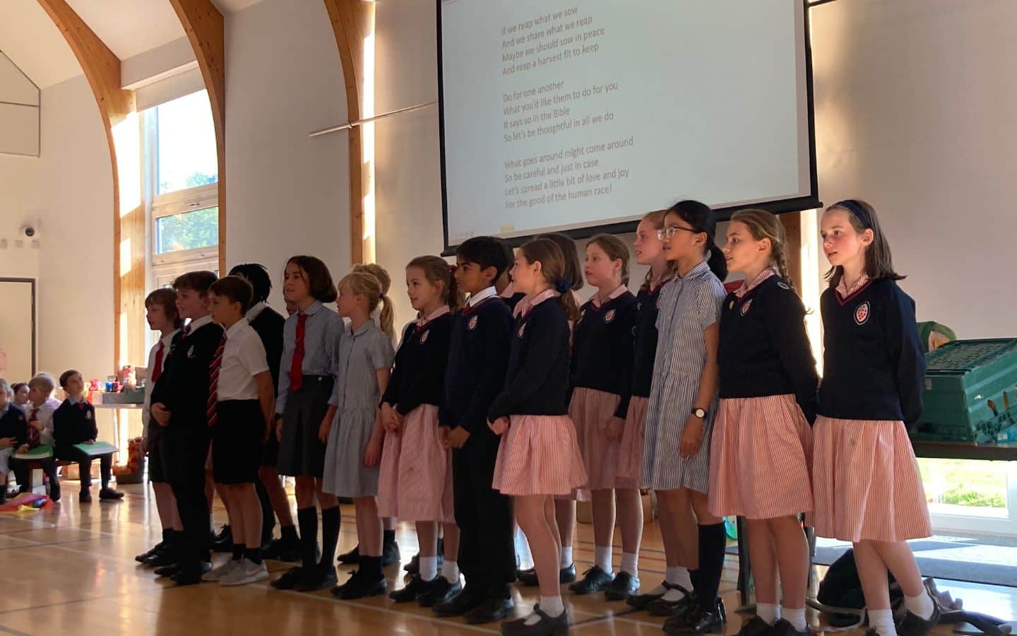 Year 6 led from the top and guided the audience through the assembly. Family and friends were treated to a mix of songs and the spoken word, all of which were performed to perfection. Michelle and Max kicked off proceedings by explaining where the Harvest donations go and asking the audience to remember how fortunate we are to have enough to eat. Year 3 took the audience on a global tour as they reflected on harvest festival traditions around the world. Year 6 sang Sow in Peace and were expertly accompanied by Mrs Hughes on piano and Barnaby B and Max M on their saxophones.