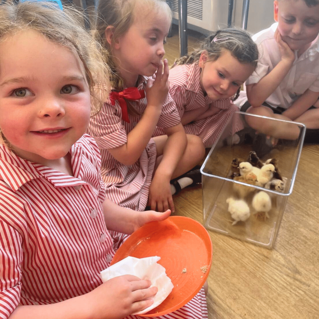 Each child has had the chance to enjoy gentle cuddles with the chicks, and our chick monitors have taken on the responsibility of changing food and water daily to keep them healthy.