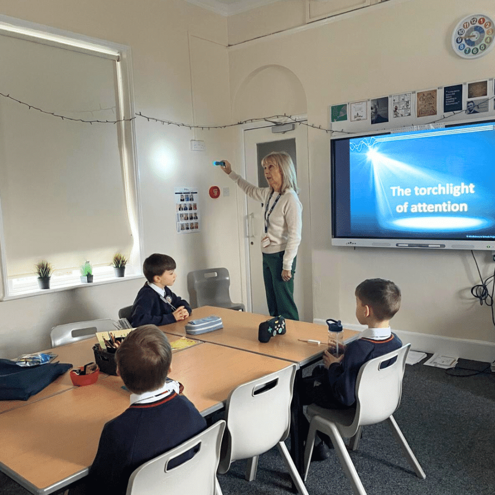 They discovered that when the torch is held close, the light creates a small, tight beam, helping us concentrate on one specific detail. When the torch is moved further away, the beam becomes much wider, allowing us to take in more of what is around us. This simple but powerful visual helped pupils understand the difference between narrow focus and wide focus, and how both can be useful in different situations.