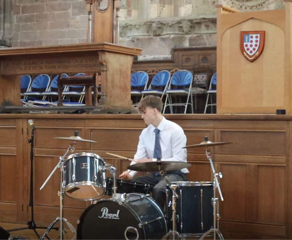 The House Song Competition was, as ever, a truly splendid occasion in College Hall. The atmosphere amongst the Houses was convivial and a lot of fun was had by all. Yes, this is a singing competition, but there are many more experiences that are gained by the pupils working together as one. The Upper Sixth have to work hard encouraging pupils to sing during the rehearsals, as well as take the lead in ‘conducting’ the houses: there were some very entertaining attempts at doing so! Musicians in each House are also required to accompany the song, whether this is just on the piano or with a full band. The standard of singing was particularly impressive from many of the Houses, which led to some difficult decisions for the adjudicator. Creighton came out on top with their rendition of Ain’t No Mountain High Enough; last year’s winners, Oswald took second place this time with Valerie and Castle were third with Uptown Girl. Two new prizes were introduced last year: the Best Band or Accompaniment went to Wulstan, and the Best Conductor went to Bright (below).