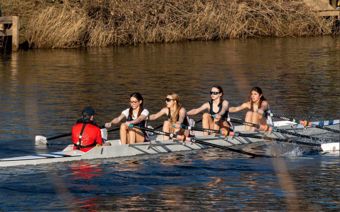 Division three brought more success, particularly in the Year 9 and 10 girls’ quad sculls. Florence and Henrietta teamed up with Evie G, Issy W, and cox Oliver C to secure a commanding win. Meanwhile, our Year 9 girls – Imogen B, Anya R, Hermione H, Henrietta H, and Zofia W – delivered an outstanding performance in their first ever race, overcoming the competition to take the championship.