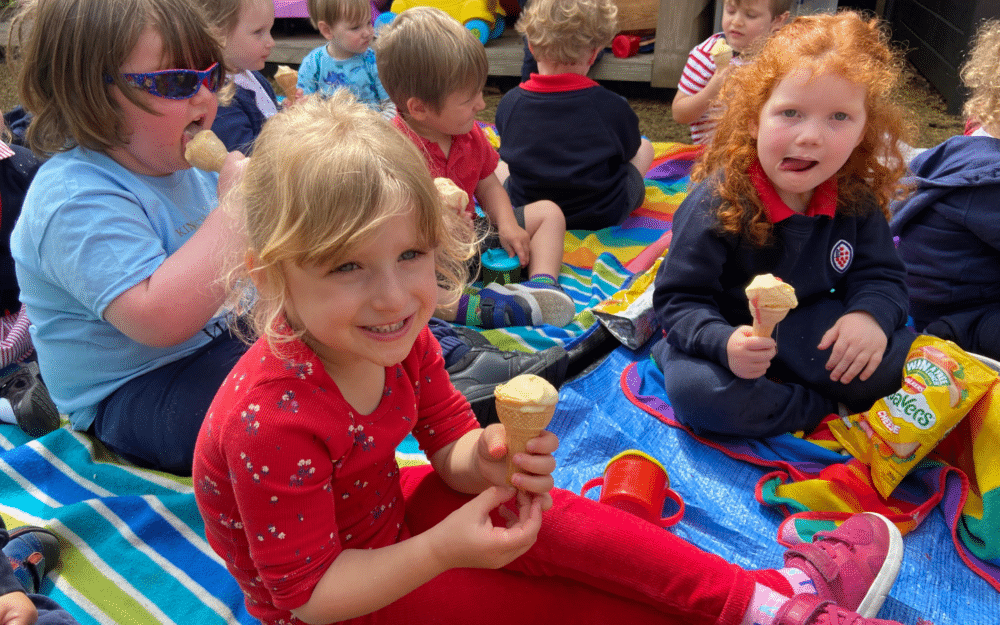 Just as the final ice-cream was devoured, a few large drops of rain started to fall from the sky! Perfect timing: our Coronation Picnic had beaten the rain! The children beat a hasty retreat back to their classrooms, full of yummy food and brilliant Hawford memories.