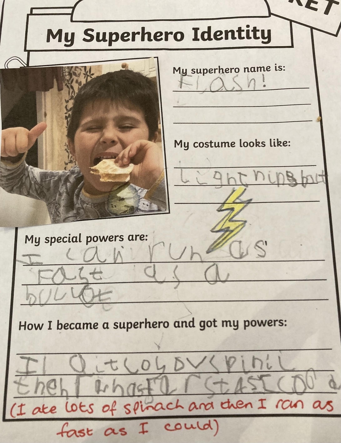 This week they have been learning about superheroes, focusing on the story, Supertato. The children have written and talked about their own superheroes. We have been amazed at the children’s imaginations and ideas about what their superheroes do and the superpowers they have! We have also thought about real-life superheroes and what they mean to us. Reception children really are superheroes; they have truly embraced and had lots of fun with their topic. They have dressed up as superheroes and have even tried to use their superhero powers! It is such a pleasure to see the progress that the children are making in all areas of their learning and we are so proud of them all for being enthusiastic and curious. We cannot wait to have them all back in school in March.